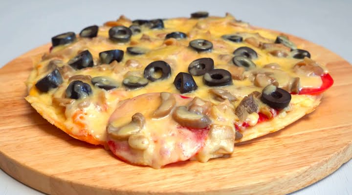 Для теста смешиваем сметану, яйца, щепотку соли и муку. После этого нарезаем начинку (колбасу кубиками, грибы или бекон), помидоры кружочками, маслины на половинки, сыр трём на тёрке. Когда начинка будет готова, приступаем к приготовлению. На хорошо разогретую и смазанную маслом сковородку (диаметр не меньше 22 см), выливаем тесто. Сверху на тесто выкладываем слоями — помидоры (не вдавливаем), колбасу, бекон или грибы, маслины. Закрываем крышкой сковороду, убавляем огонь на минимум и готовим минут 10. Затем густо посыпаем пиццу тертым сыром и снова закрываем крышкой. Пицца готова, когда края и низ будут золотисто-коричневого цвета, а сыр расплавится.